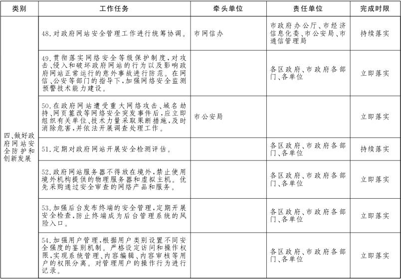 (一)加强网站安全防护。政府网站要根据网络安全法等相关法律法规要求,贯彻落实网络安全等级保护制度,加强网络安全监测预警技术能力建设,建立安全监测预警和应急处置机制,定期开展网站安全管理和防护检查。政府网站服务器不得放在境外,禁止使用境外机构提供的物理服务器和虚拟主机。对监测发现或网民举报的假冒政府网站,经核实后,市政府办公厅要及时会同网信部门处理。在政府网站遭受重大网络攻击、域名劫持、网页篡改等网络安全突发事件后,公安部门应立即组织有关单位、技术力量采取果断措施,及时消除危害,并依法开展调查处理工作。